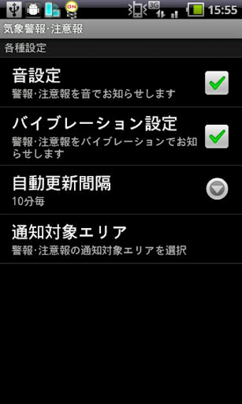 気象警報・注意報では、通知があった時にアラーム音を鳴らすかバイブレーションを振動させるか設定できます。更新の間隔は3分から60分ごとに設定できる他、トップ画面右上の矢印ボタンをタップすると発表が更新されます。